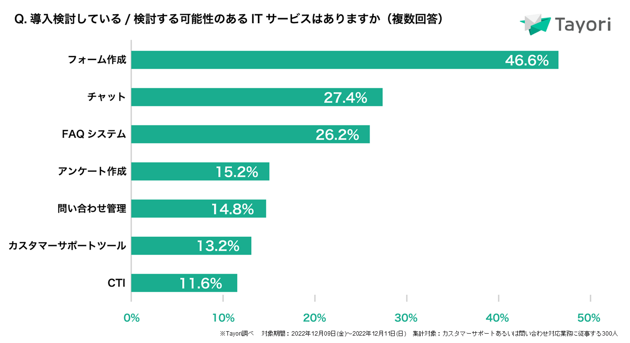 - システムへの投資は増加の傾向。フォーム作成が約半数の46.6%、チャット、FAQシステムと続く