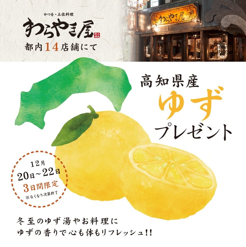 株式会社DDホールディングスの連結子会社である株式会社ダイヤモンドダイニング(本社:東京都港区、代表取締役社長:松村厚久)が運営する土佐料理専門店「わらやき屋」は、ご来店いただいたお客さま全員にゆずをプレゼントする「ゆず活」イベントを12月20日(月)より下記店舗にて実施いたします。