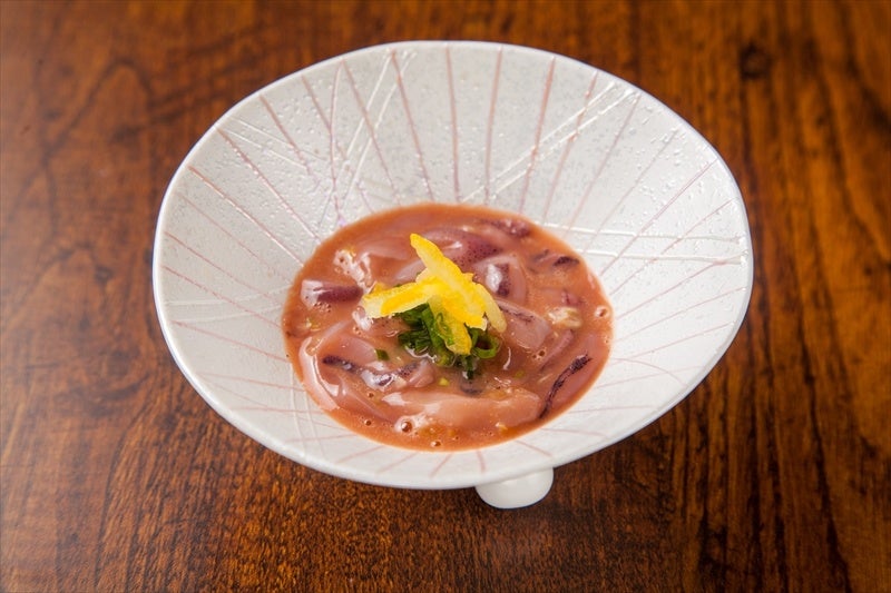 この「わら焼き」で仕上げた“オーダー率ほぼ100%"とも言われる絶対的看板メニューが「”かつを”の塩たたき」です。焼き立ての温かな身を分厚く切りつけた「たたき」は、「室戸の塩・わさび・にんにく」を併せるのが土佐流且つ最も美味しい食べ方。