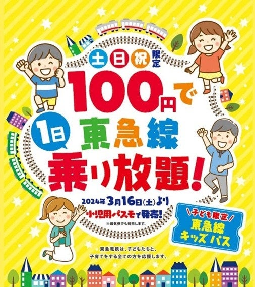 継続的に子育て世代の負担を軽減するため、土休日に小児のお客さまが100円で東急線を1日乗り降り自由でご利用いただける「東急線キッズパス」(以下、本乗車券)を、2024年3月から発売しています。通常の東急線ワンデーパス(小児:390円)と比較して7割以上もお得にご利用いただける本乗車券を、より多くの子育て世帯のお客さまにご利用いただくことで、継続的な負担軽減に取り組んでいます。