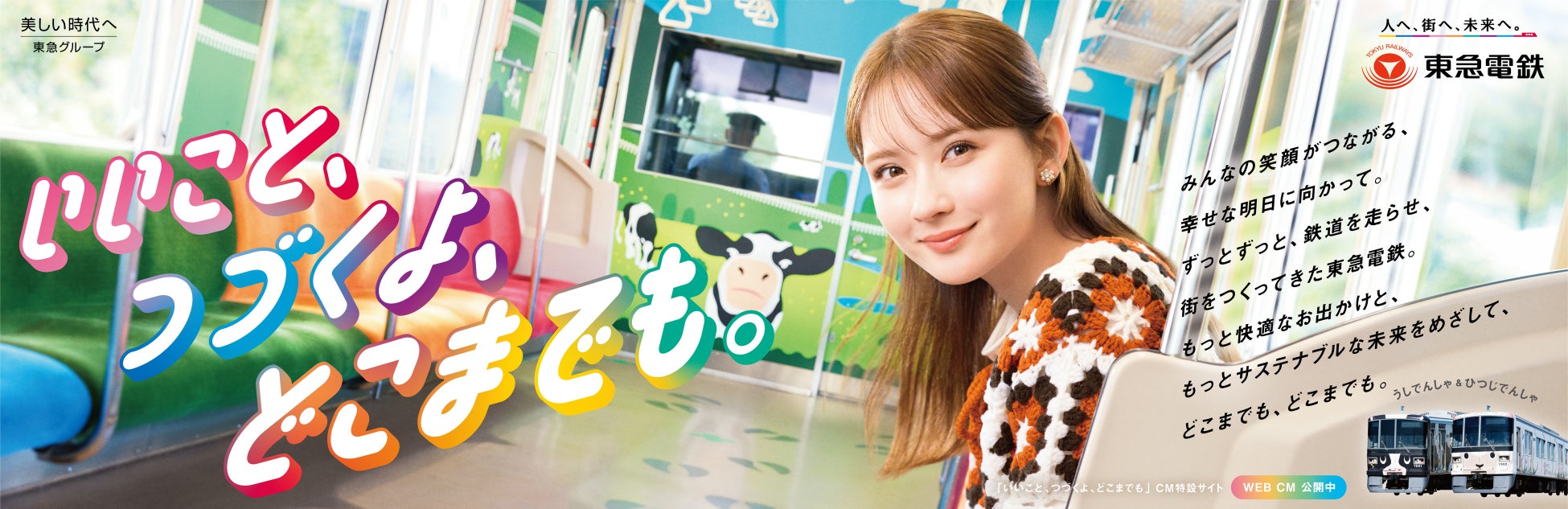 これまで若年層の認知向上を目的に展開してきた「いいこと、つづくよ、どこまでも。」シリーズですが、今回は東急線沿線の子育て世帯をより一層応援していきたいという想いから、こどもの国線のラッピング電車「うしでんしゃ」を舞台に、畑 芽育さんが姉・甥っ子とお出かけする物語を通じて、「子育てにやさしい東急線」というメッセージをお届けします。
