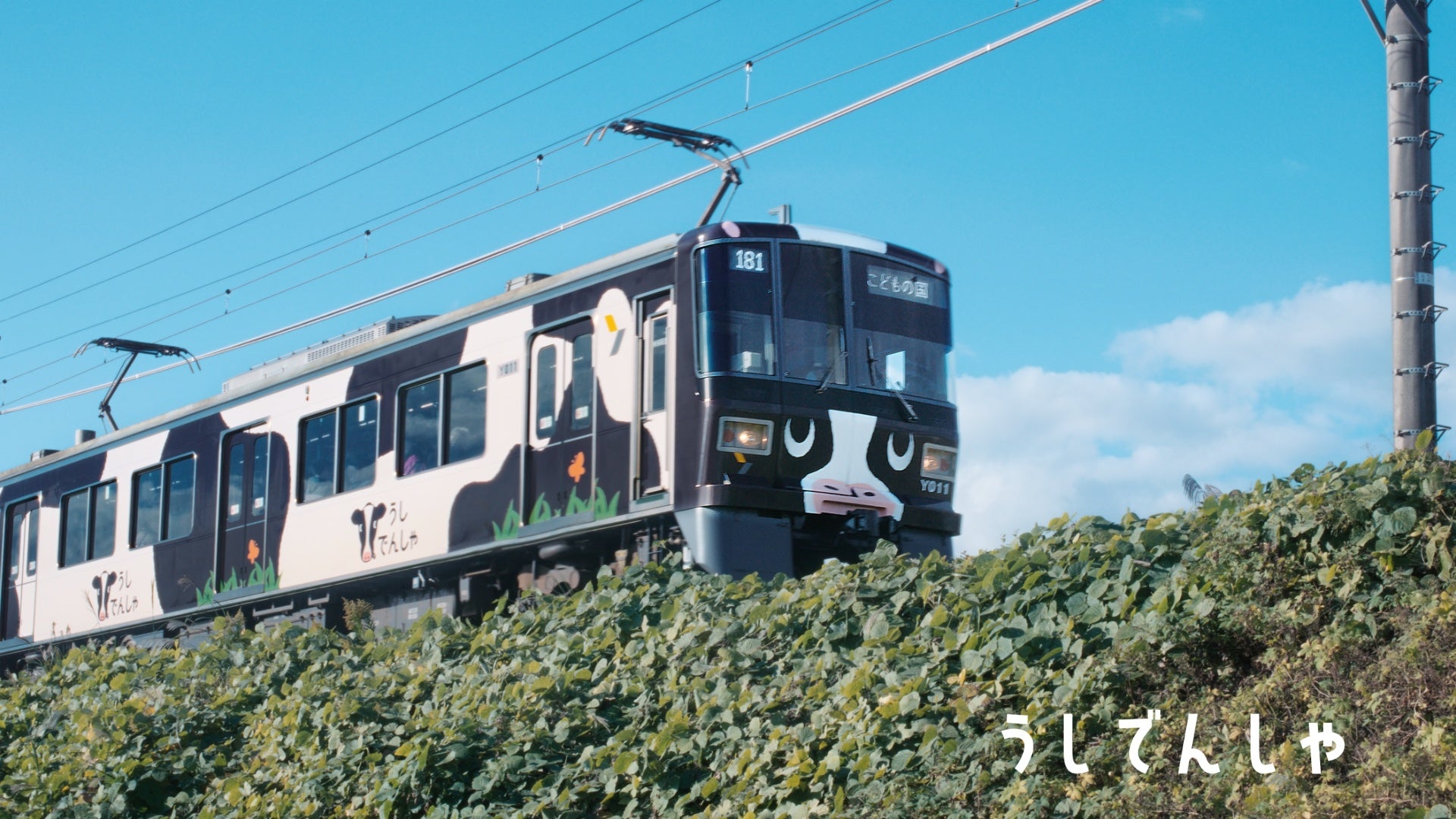 こどもの国線の「うしでんしゃ・ひつじでんしゃ」は、雪印こどもの国牧場にいる可愛らしい「うし」と「ひつじ」をイメージしたラッピング電車です。内装(壁面・床面)は牧場風景のラッピングを施しており、電車に乗りながら牧場にいるような感覚を楽しめます。