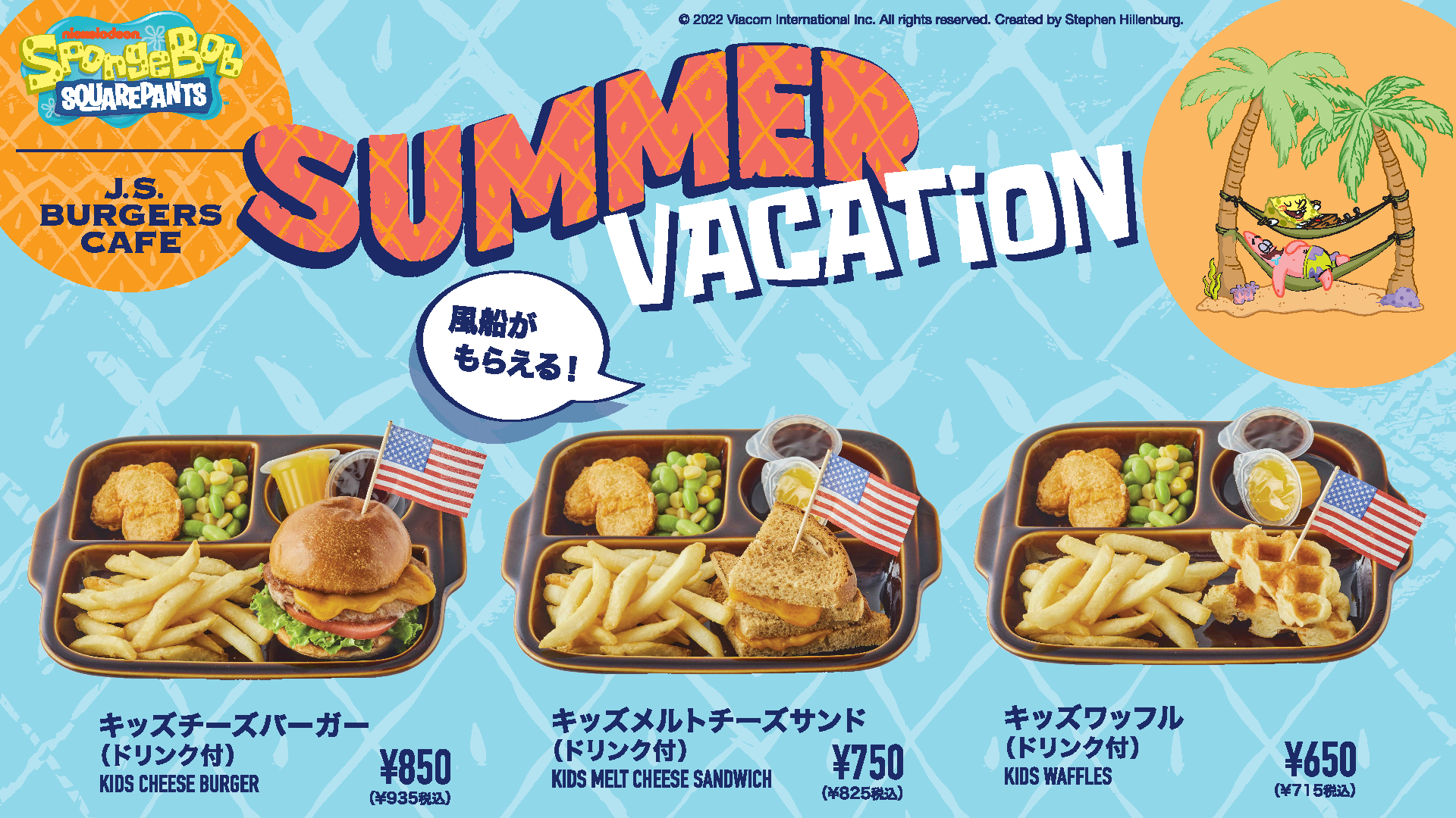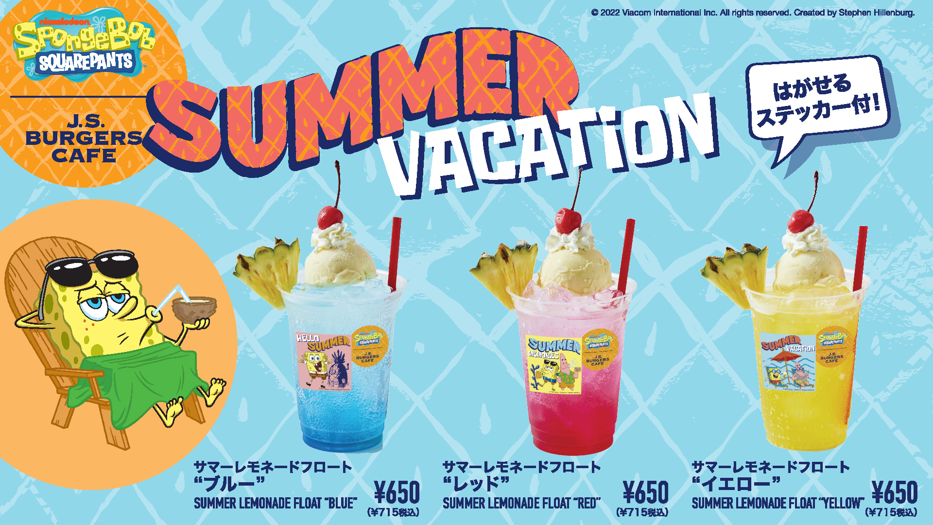 | ■J.S. BURGERS CAFE × SpongeBob SquarePants コラボレーション概要 展開期間:7月14日(木)~8月31日(水) 展開店舗:J.S. BURGERS CAFE 全店 展開商品: 「スポンジ・ボブ」コラボ サマーレモネードフロート(ブルー/レッド/イエロー) ※ステッカー付 各650円(税込716円) コラボレーション企画: ①キッズメニューをご注文で「スポンジ・ボブ」コラボバルーンをプレゼント(数量限定) ②スポンジ・ボブがお出迎え!大型パネルやポスターなど、スポンジ・ボブの世界観をお楽しみいただけます。 |