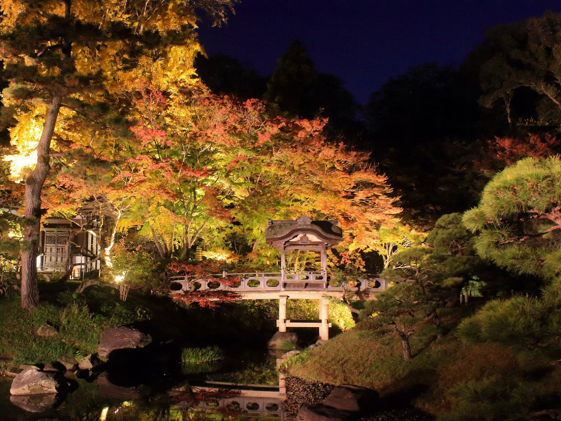 日中は黄金色に輝くイチョウ、色鮮やかなカエデやイロハモミジが楽しめる三溪園では、週末限定で紅葉や古建築のライトアップをおこないます。三溪園のシンボルである三重塔や古建築が黄金色に輝く、昼間とは異なる幻想的な景観をお楽しみください。