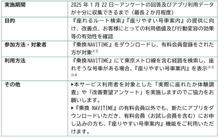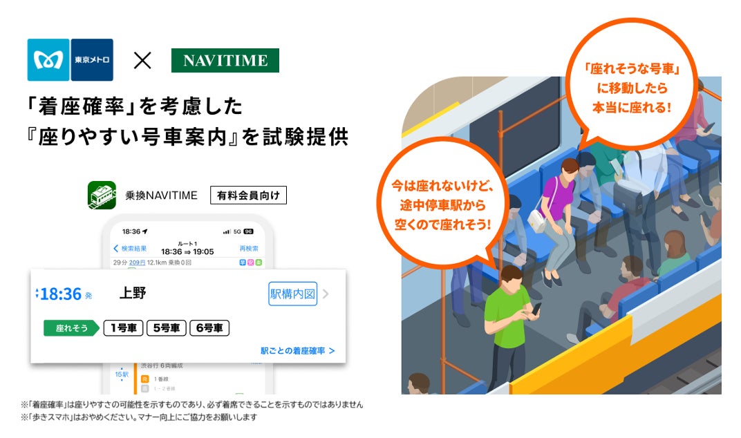 東京地下鉄株式会社(代表取締役社長:山村 明義、本社:東京都台東区、以下「東京メトロ」)と、株式会社ナビタイムジャパン(代表取締役社長:大西 啓介、本社:東京都港区、以下「ナビタイムジャパン」)は、2025年1月22日(水)から、『乗換NAVITIME』アプリの有料会員限定で『座りやすい号車案内』を試験提供し、将来の『座れるルート検索』機能の提供に向けた検証を実施します。