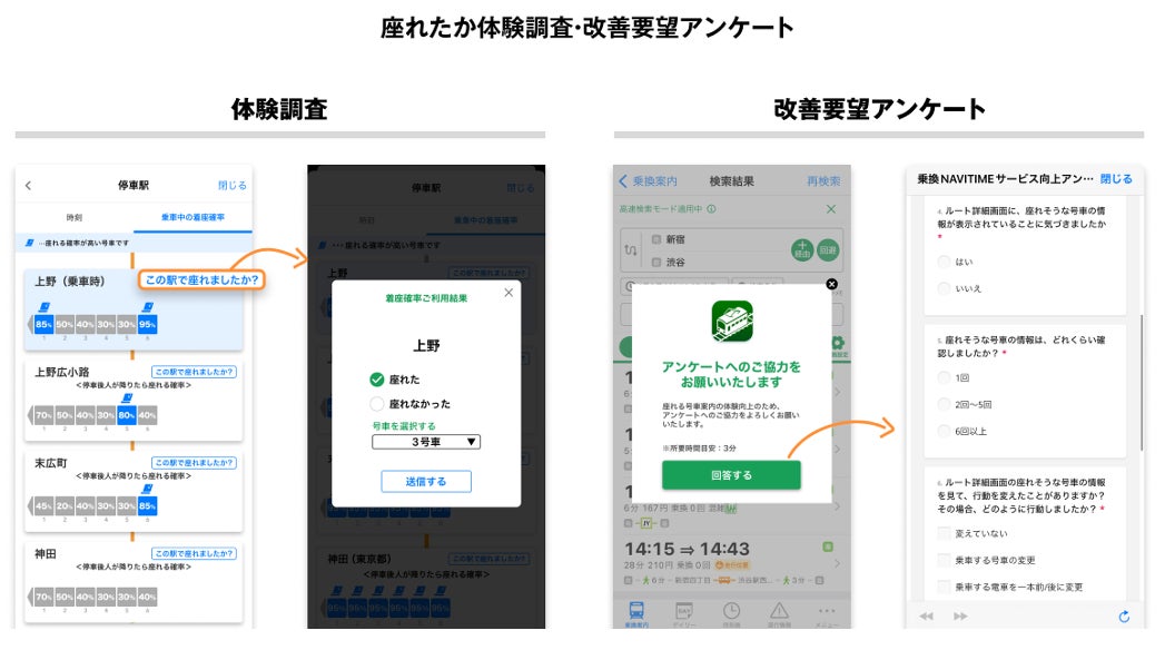 試験提供中は、『乗換NAVITIME』の画面内で、対象者の方が参加できる「実際に座れたか体験調査」や「改善要望アンケート」を実施します。さらにアプリの利用ログと実際に座れたか体験調査の結果を分析し、行動変容が起きたか、実際に座れたか、といったサービスの効果検証も行います。