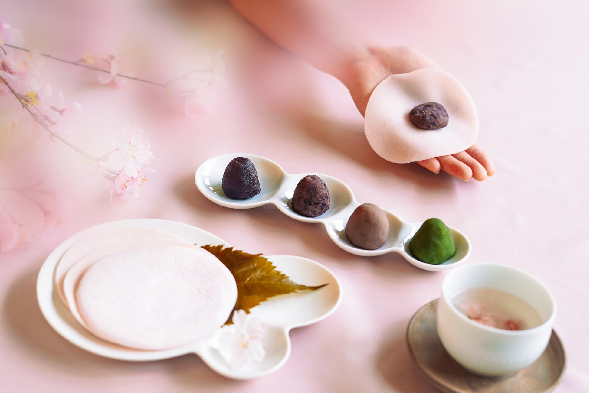 日本三大和菓子処の一つに数えられる島根県松江市。春らしい和菓子を味わってもらうために、オリジナルの手作り桜餅を販売します。松江市で一般的に食べられる桜餅は、関東で親しまれているクレープ状の薄い生地に餡を包んだ「長命寺風桜餅」。明治時代に松江藩の家老を勤めた有澤宗閑(ありさわそうかん)が、隅田川の桜餅を再現して作らせたのがはじまりだと言われています(*1)。桜餅は、地元の老舗和菓子店「風流堂」とコラボレーションしたもので、界 玉造のためだけに作られた和菓子です。4種類の餡の中から好きな餡を選び、桜を練り込んだ生地に包むことで、自分だけの桜餅を楽しめます。館内には桜をテーマに装飾をしたテラスを用意するので、春の木漏れ日の中、桜餅でお茶の時間を過ごすのもお勧めです。