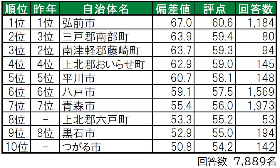 4年連続で弘前市が1位で、「住みここち」でも1位に輝いています。2位は三戸郡南部町、3位は南津軽郡藤崎町です。トップ10内では、8位に初登場の上北郡六戸町(かみきたぐん ろくのへまち)がランクインしています(昨年は累計回答者数が50名未満でランキングの集計対象外)。