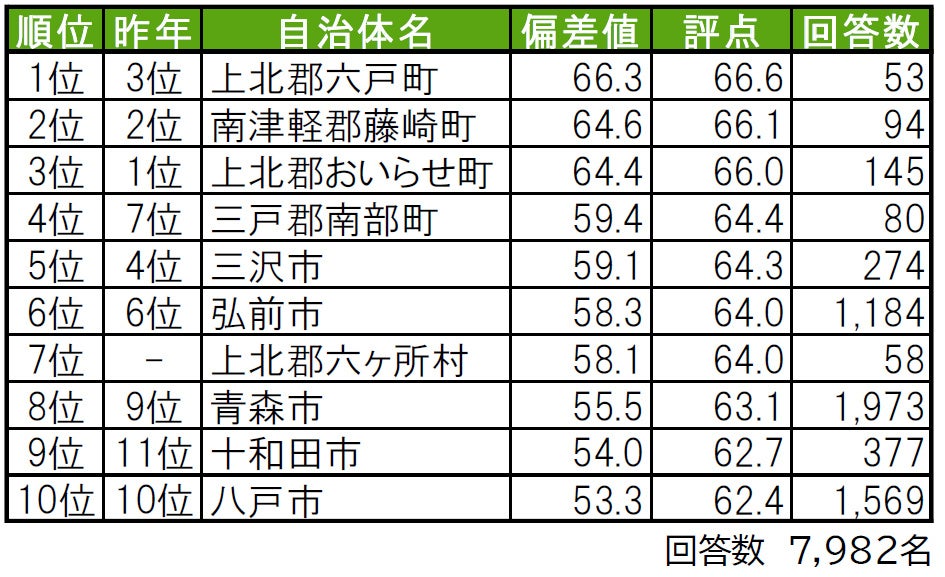 1位は上北郡六戸町で、昨年3位から順位を上げました。2位は、2年連続で南津軽郡藤崎町です。3位は上北郡おいらせ町で、「住みここち」で2位の街です。トップ10内では、7位に初登場の上北郡六ヶ所村がランクインしており、トップ10内で唯一郡部に属する「村」です(昨年は累計回答者数が50名未満でランキングの集計対象外)。その他、昨年から順位を上げてトップ10入りしたのは、9位の十和田市(昨年11位)です。