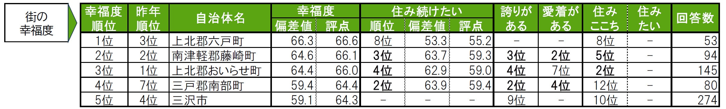 街の幸福度1位は上北郡六戸町。2位は2年連続で南津軽郡藤崎町。3位上北郡おいらせ町。