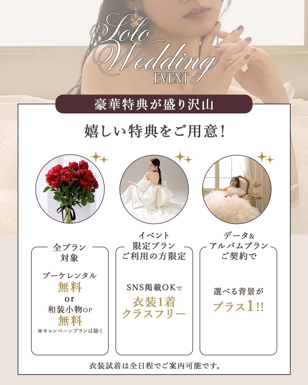 【12月13日〜12月19日まで開催】ソロウェデイングイベント、限定プラン 豪華特典もお見逃しなく!