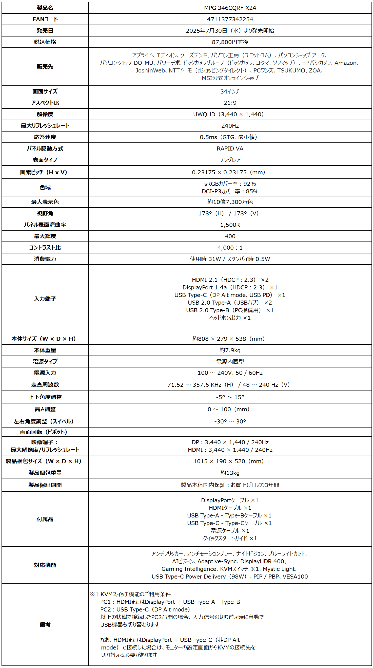 この度、エムエスアイコンピュータージャパン株式会社は2025年7月30日(水)より、ゲーミングモニターの新モデルを発売いたします。高いゲーミング性能と豊富な機能を備えた『MPG』シリーズから、34インチの湾曲UWQHD(3,440 × 1,440)解像度、240Hz・0.5ms(GTG、最小値)の高いゲーミングスペックにより、動きの激しいゲームタイトルも滑らかに表示でき、KVMスイッチやUSB PD98W、Gaming Intelligenceに対応で、性能・機能・快適性を備えた「MPG 346CQRF X24」が新たにラインナップに加わります。