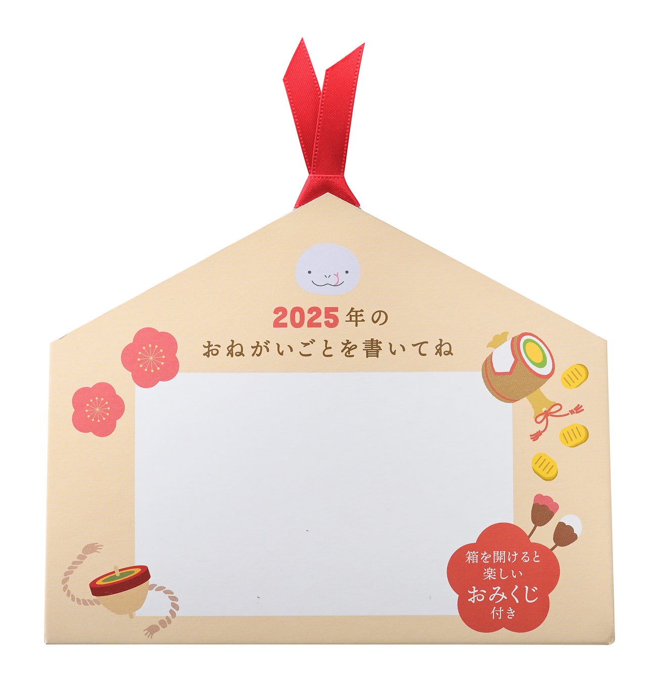 特長:干支の“巳(み)”のイラストが入った絵馬型ボックスに、お正月にちなんだ“鏡餅”と“巳”をデザインしたクッキーをアソートしました。ボックス内側のツメ部分には、思わず笑みがこぼれるおみくじ付き!裏面に願いごとを書いて飾ってね♪