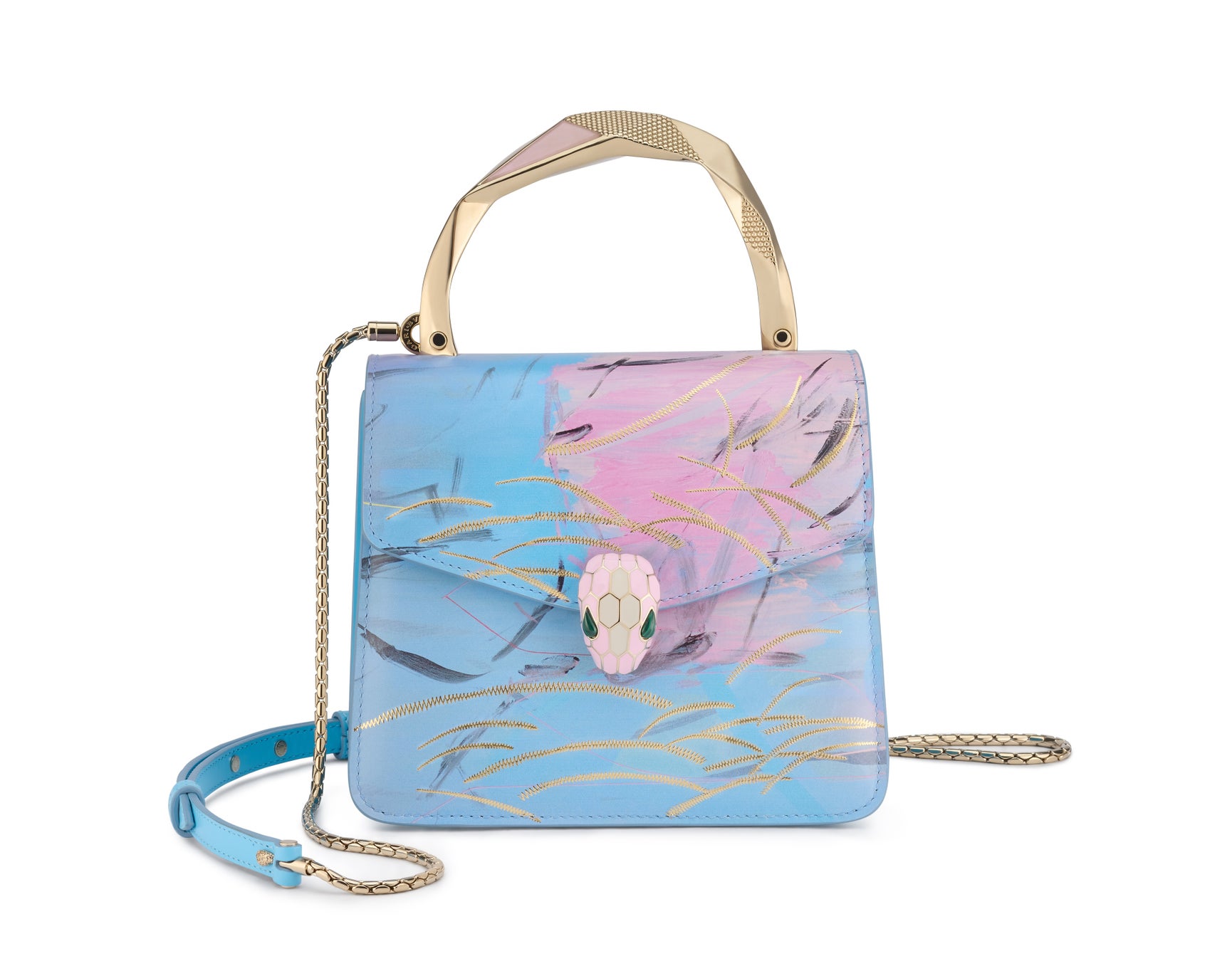 絵画から彫刻、インスタレーション、パブリックアートまで、多面的な才能を発揮する中国人アーティストのジョウ・リは、叙情的な抽象絵画の独特な表現を通して、セルペンティ フォーエバー トップハンドルを再構築しています。そのイメージからオーシャン と名付けられた1つ目のクリエーションは、彼女の絵画作品のシリーズで人類の自由と希望をテーマにした《Landscape of Nowhere: Water and Dreams》がベースとなっています。ブルーとピンクのアイコニックな組み合わせとジョウ・リの繊細な絵筆のタッチがカーフレザーのボディに新たな生命を吹き込み、夢のような世界を描き出します。