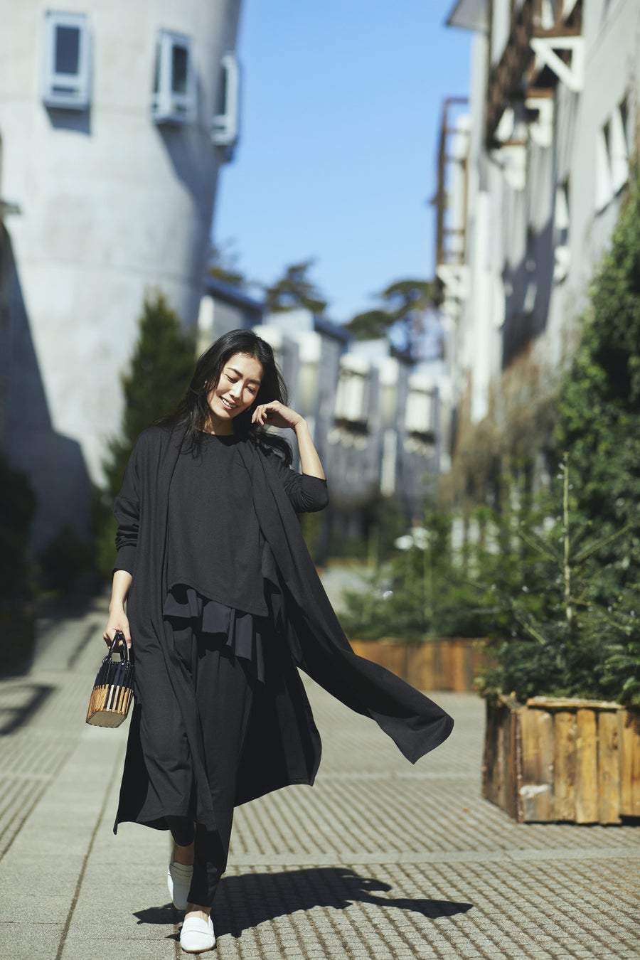 ひと所にとどまらないライフスタイルになった今、外出先や旅行先、家事をしているとき、リビングでゆっくり過ごしているときなど、どんな時間でも心地よく過ごせる自由な服を制作しました。