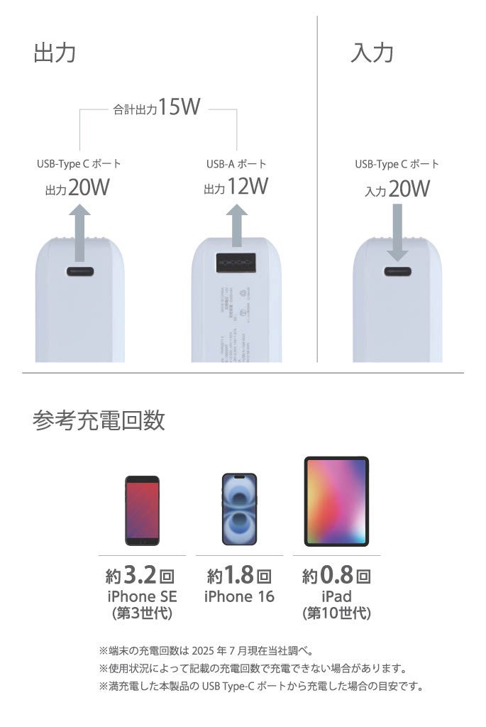 ※満充電した本製品で電源がオフの状態のスマートフォンを充電する際の目安回数です。充電中に電源を入れたり、機器を使用したりしている場合は記載の数値まで充電できない場合があります。