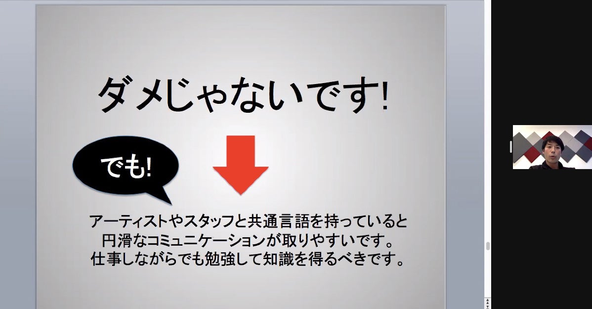 そこから、チャットへの書き込みが止まらないということで、質問コーナーへ。「普段どんなスケジュールで仕事をしていますか?」と聞かれれば、一週間のスケジュール表を出して、スタジオ作業で夜遅くなることもあれば、逆にテレワーク対応の日もあったりと、フレキシブルに働ける環境をわかりやすく説明。また、「音楽の知識がないとダメですか?」という質問には、「ダメではないです!でも、アーティストやスタッフとの共通言語を持っているとコミュニケーションが円滑になるので、勉強することをオススメします」と丁寧に答えていきます。
