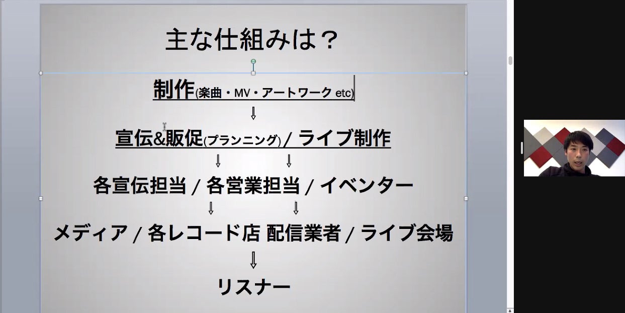 いよいよ、話は本題の音楽制作について。まずは音楽が世の中に届けられるまで、制作、宣伝&販促、ライブ制作、営業担当、イベンター、メディア、レコード店や配信業者などいろいろな人が関わっていることを説明。制作担当については、「ざっくり3パターンにまとめてみました。ひとつめはディレクター型でスタジオ作業になったら自らディレクションをするタイプ。ふたつめはA&R型で宣伝のプランニングに重きを置いて、制作はプロデューサーを立ててスケジュールや予算の管理など全体を見るタイプ。みっつめは、最近レコード会社がマネージメントも一緒に行うことが増えたので、マネージメント業務も含めて制作に携わるタイプがあります」とわかりやすく話します。