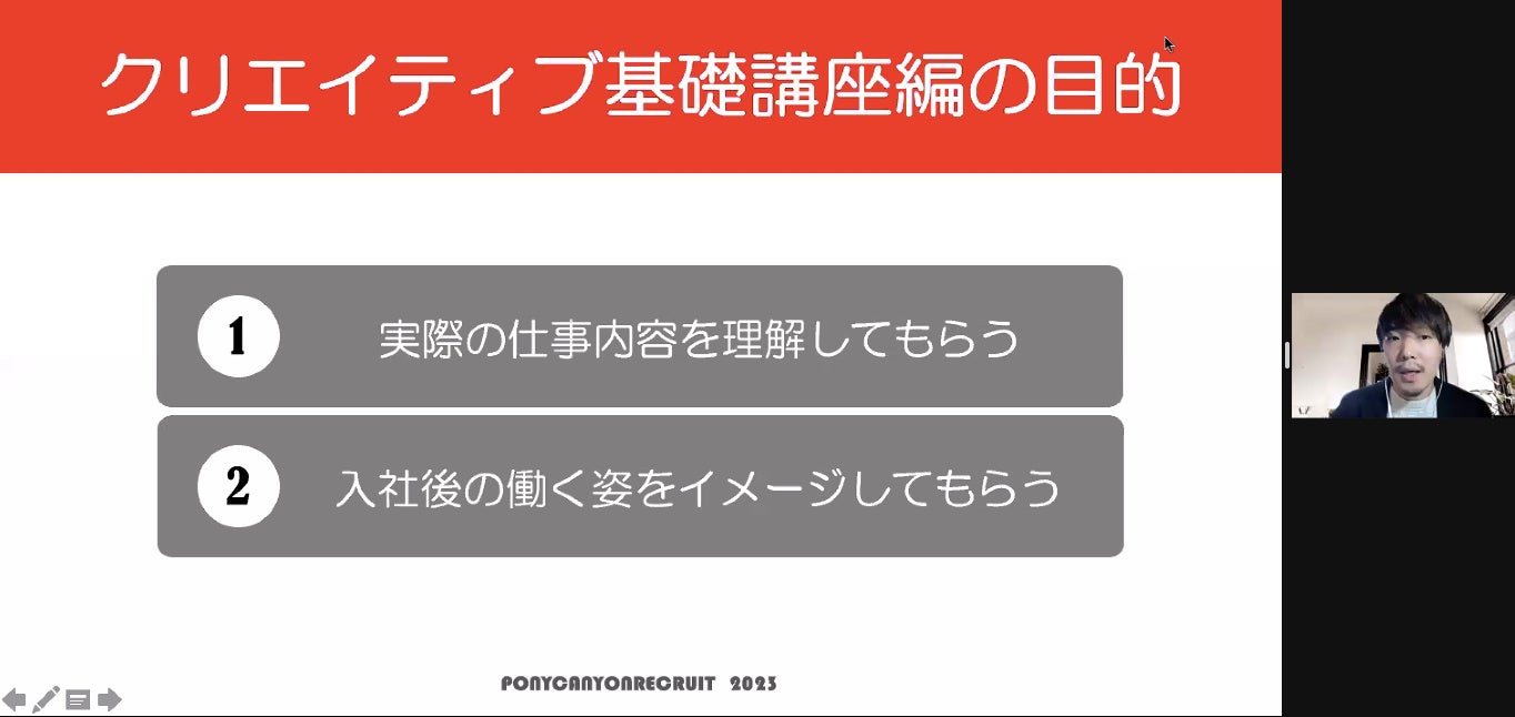 今回は約500名の就活生がオンラインにて参加。まず人事担当者が講座の目的について「実際の仕事内容を理解してもらうのと、入社後の働く姿をイメージしてもらうきっかけにしてください!」と説明。すると早速「ポニーキャニオンの淵上です!」と爽やかに登場し、講座がスタート。