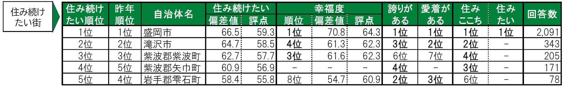 住み続けたい街は2年連続で、1位盛岡市、2位滝沢市、3位紫波郡紫波町。