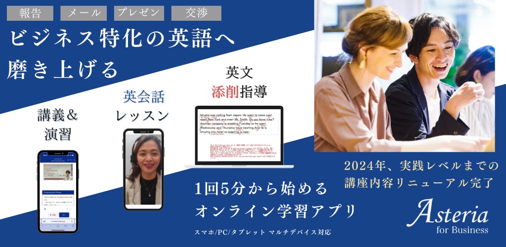 「Asteria for Business」は、大学生・社会人向けビジネス英語講座です。学習アプリを使い、実践指導を組み込んだ学習サイクルで、ビジネスで「使える」英語を身につけます。