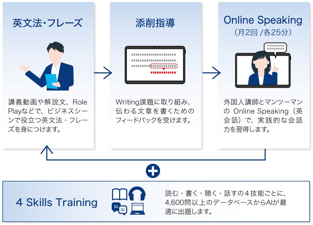 「Asteria for Business」はビジネスシーンを意識した知識の習得から始まり、添削指導・Online Speakingで実践し、指導を受けて改善する、という学習サイクルで進めます。日々の学習で気づいた課題は、Z会独自のAIを用いた「4 Skills Training」で解消することができます。