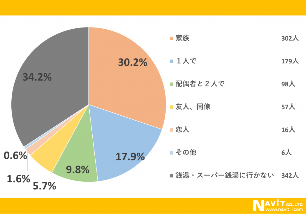 銭湯・スーパー銭湯に一緒に行く人については、「家族」が30.2%、「1人で」が17.9%、「配偶者と2人で」が9.8%という順になりました。