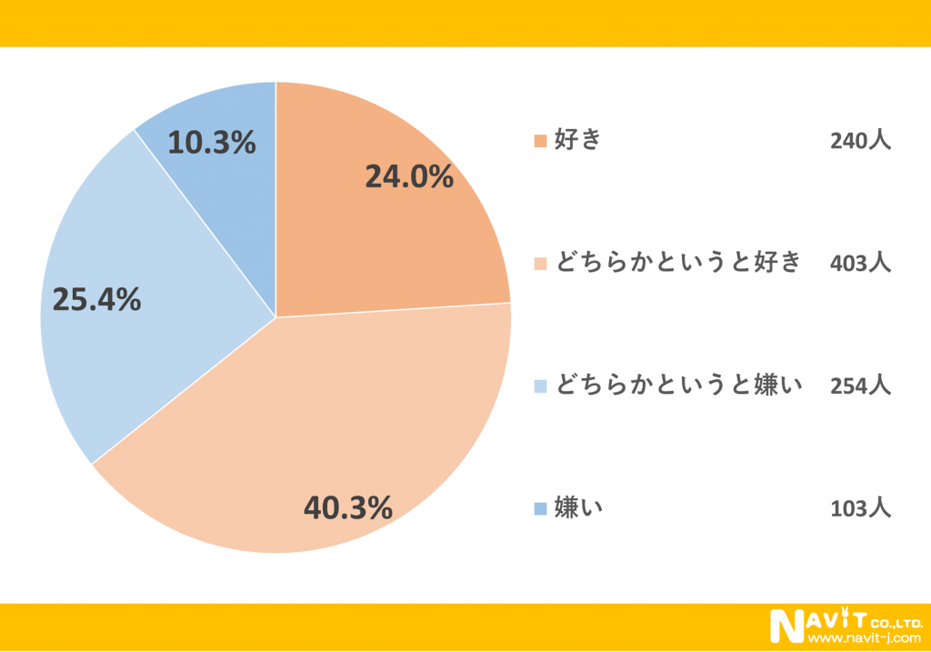「あなたは銭湯・スーパー銭湯が好きですか?」という質問については、「好き」が24.0%、「どちらかというと好き」が40.3%という結果になり、合わせると64.3%の人が銭湯・スーパー銭湯が好きだということが分かりました。