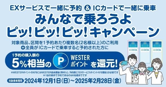 対象期間中、EXサービスにおいて山陽新幹線を含む区間を2名様以上でご予約いただき、かつ、全員がチケットレスでご利用いただいた方へ、WESTERポイントを還元します。