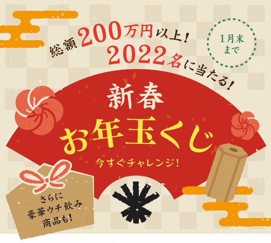 これまでお友だちとして当社を応援いただいたお客さまはもちろん、新しくお友だちになっていただき、これからお店を応援してくださるお客さまに向け、感謝の気持ちを込めて、店舗で使える「ソト飲み用」プレゼントとご自宅でご堪能いただける「ウチ飲み用」プレゼント、計3つの商品がそれぞれ抽選で当たる「お年玉くじ」をご用意させていただきました。