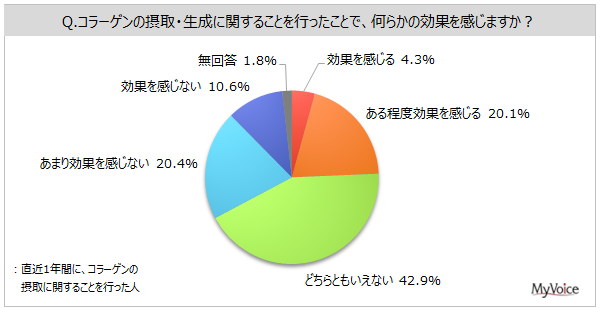 【コラーゲンの摂取に関する調査】コラーゲンの摂取に関心がある人は3割強。直近1年間にコラーゲンの摂取に関することを行った人のうち、効果を感じる人は2割強。女性では効果を感じない人の方が多い