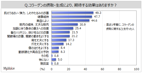 ■直近1年間にコラーゲンの摂取に関することを行った人が期待する効果は、「肌のうるおい・弾力、しわやたるみ改善」「健康維持」「美容によい」が各40%台、「筋肉の維持、丈夫な筋肉」が3割強