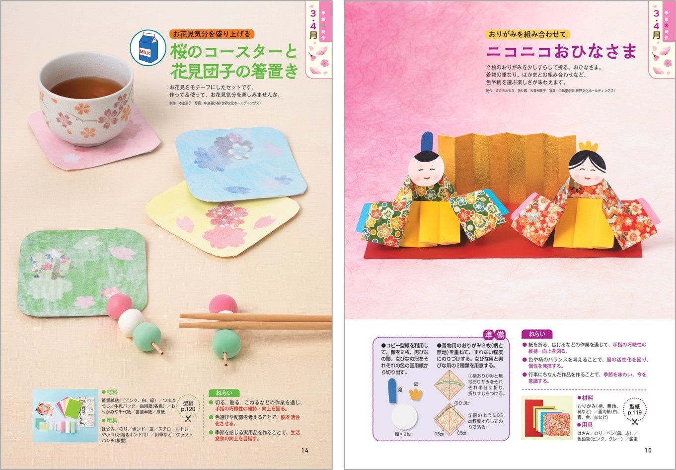 ・季節の制作「ニコニコおひなさま/いちごの吊るし飾り/桜のコースターと花見団子の箸置き」
