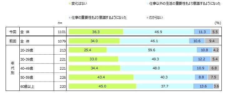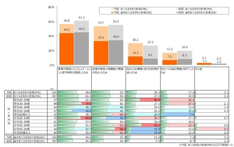 一方で、「会社の同僚等と接する時間が減ったため(30.2%)」の割合は増加しており、職場でのコミュニケーションが希薄化したことが、より仕事以外の生活の重要性を意識させることに繋がっていると推察される。