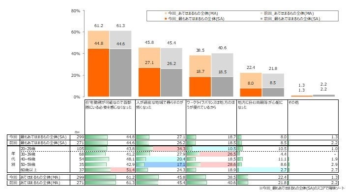 - 地方移住への関心は、前回同様若年層ほど「関心が高まる」傾向。関心が高くなった理由としては「在宅勤務が可能なので首都圏にいる必要を感じなくなった」が1位。