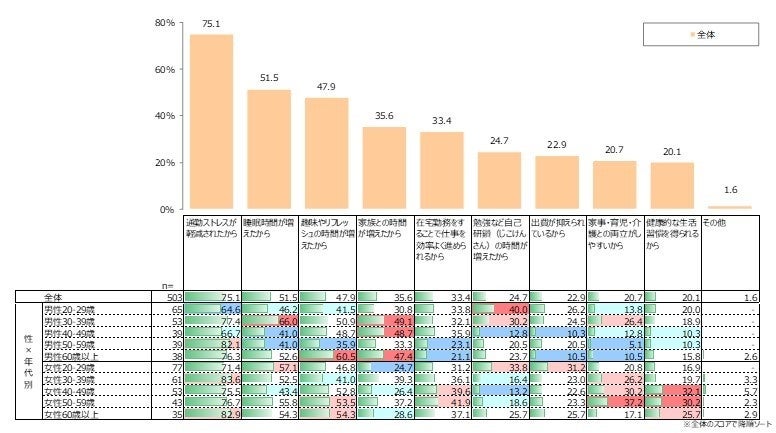 ■幸福度が上がった理由としては、「通勤ストレスが軽減されたから(75.1%)」「睡眠時間が増えたから(51.5%)」「趣味やリフレッシュの時間が増えたから(47.9%)」が主な理由。男女別では、男性で在宅勤務により「家族との時間が増えたから」、女性で「家事・育児・介護との両立がしやすいから」が異性より高い傾向となった。