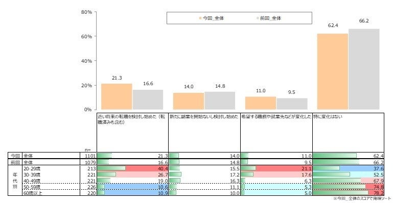 ■在宅勤務を機に転職や副業を検討したり、希望する職務や就業先が変化した人の割合は合計で46.3%に上り、前回(40.9%)より増加。転職を検討したり希望職務が変化した人は若い世代ほど多い一方で、副業については世代間の差はそこまで大きくなかった。