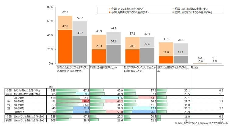 ■意欲が高まった理由は、「現在の会社でのスキルアップの必要性をより感じたため(67.5%)」が1位で、その割合は増加。30代を中心に若い世代(20代~40代)でその傾向が強かった。一方、「時間に余裕が出来たため(40.9%)」は前回より減少。「起業やフリーランスとして独立や転職に備えるため(37.6%)」「副業に必要なスキルアップのため(30.1%)」は横ばいだった。