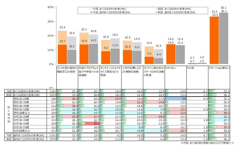 ■会社等からの健康面へのサポートの必要性については、「メンタル面の個別の相談窓口の設置(23.4%)」が1位となり、前回(19.4%)より増加。「外部のプログラムの紹介や参加への金銭補助(22.1%)」は微増したが2位で、前回と順番が逆転する結果となった。