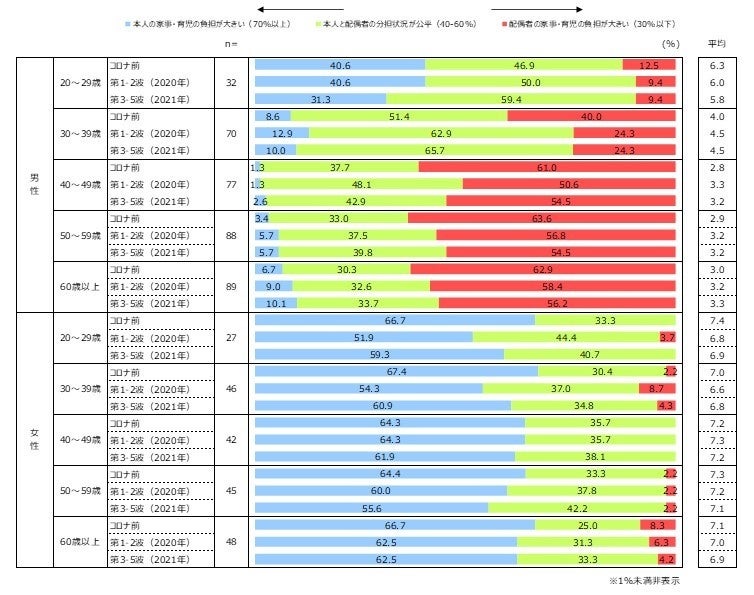 Q1.(「同居の配偶者あり」の方のみ)あなたと配偶者との家事や育児の分担状況について「コロナ前」「第1-2波(2020年)」「第3-5波(2021年)」それぞれについてお答えください。(単回答)
