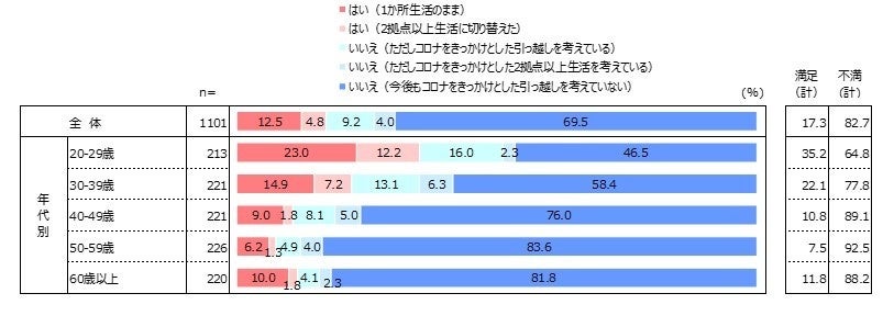 ■コロナがきっかけで引っ越した人の割合は17.3%に上った。その内、「2拠点居住の生活に切り替えた」人も4.8%いた。年代別でみると、20代で35.2%、30代で22.1%がコロナをきっかけに引っ越しており、生活への大きな影響が見て取れる。