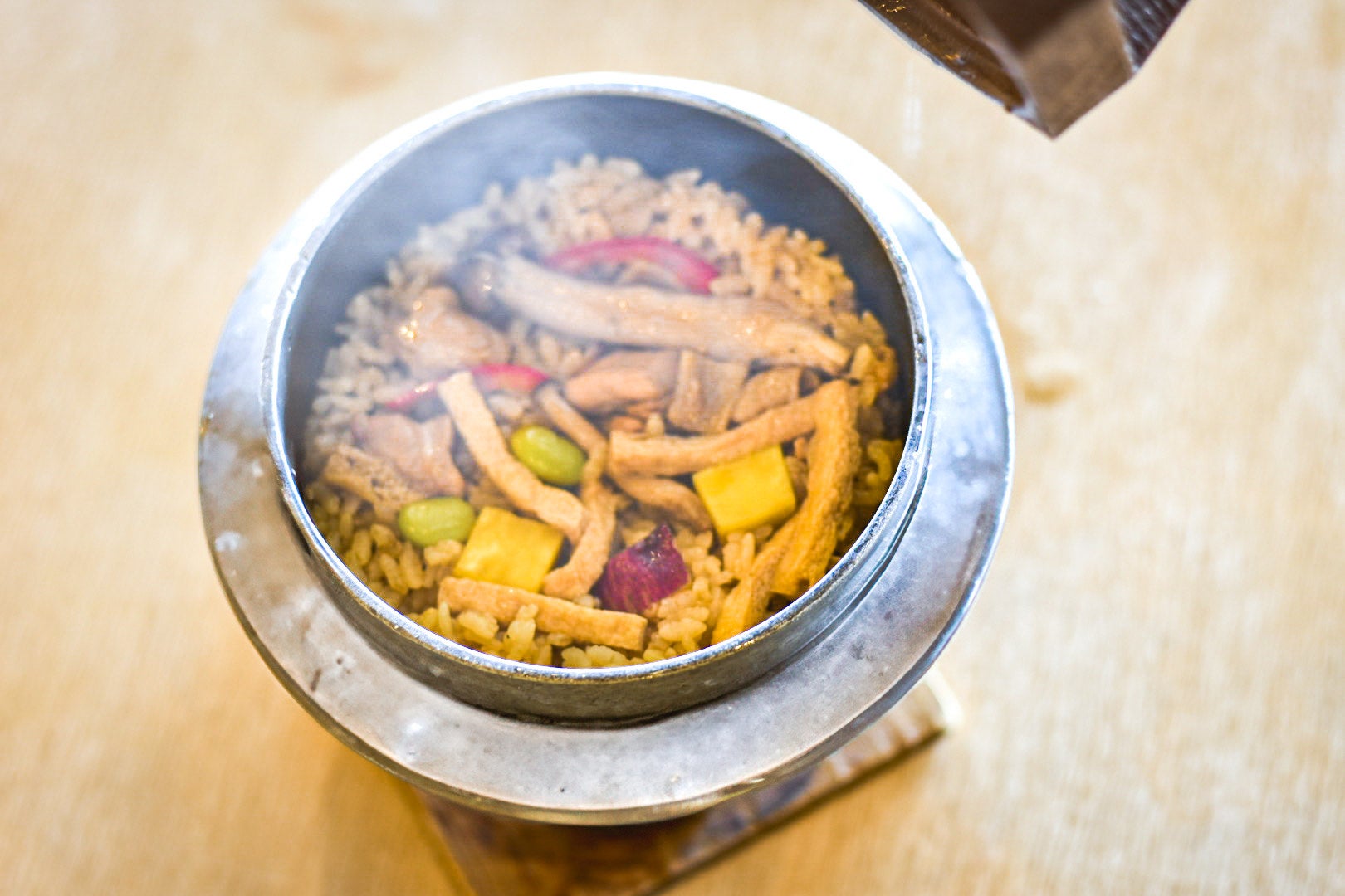 きのこやほくほくのさつまいも、豚肉がメインの、秋の食材たっぷりの釜飯です。