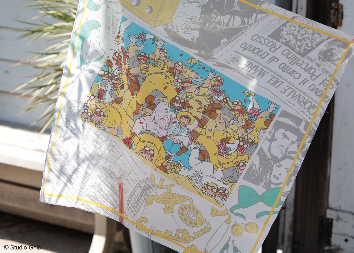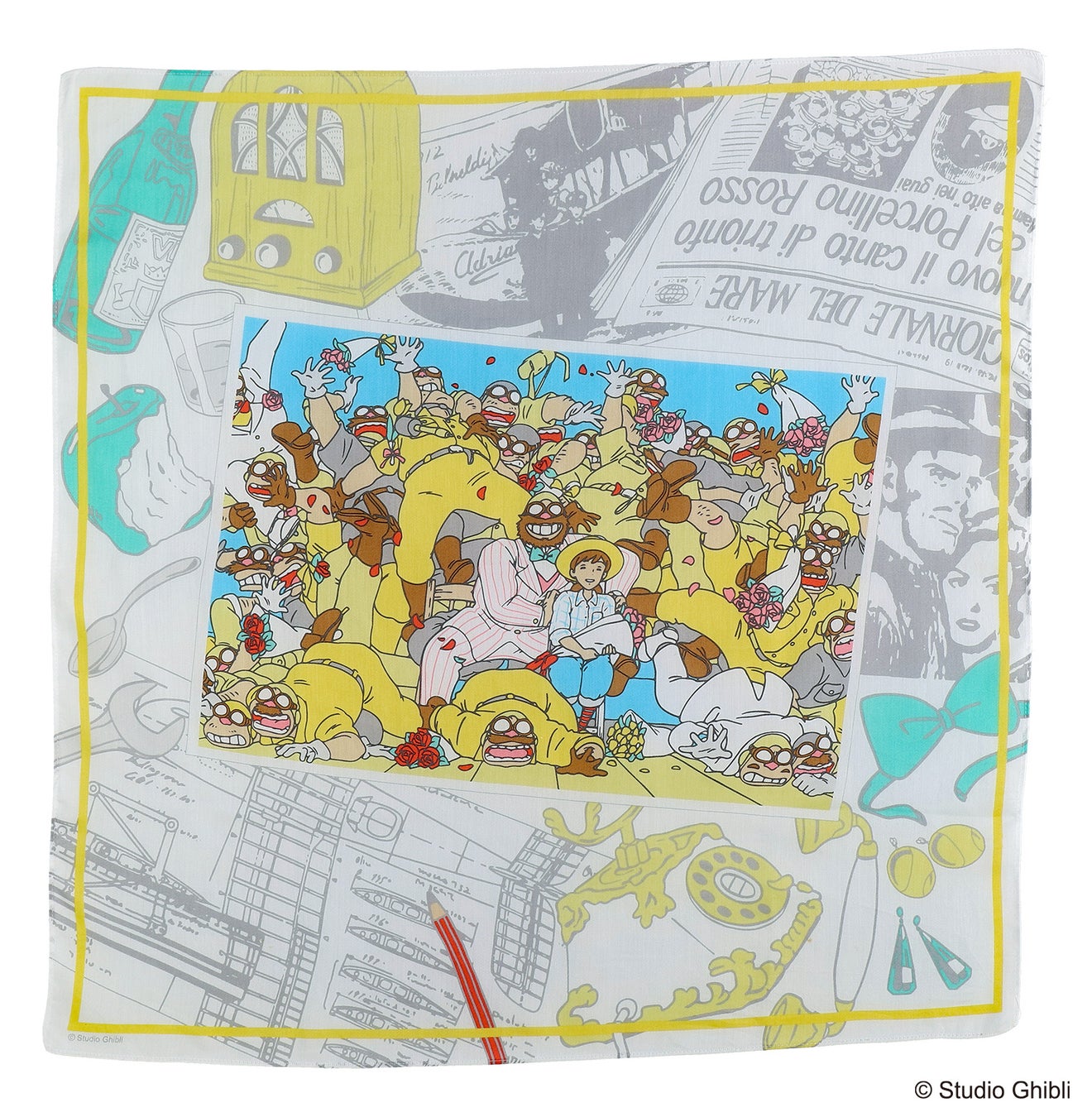 ポルコとカーチスの決闘前に撮影されたマンマユート団・空賊連合とフィオとの記念写真をデザインした大判ハンカチです。記念写真の背景にはフィオの仕事道具やポルコが人間だった頃の写真、ジーナがポルコと話した電話など、作品を想起させるモチーフがあしらわれた、30周年を記念する一枚です。