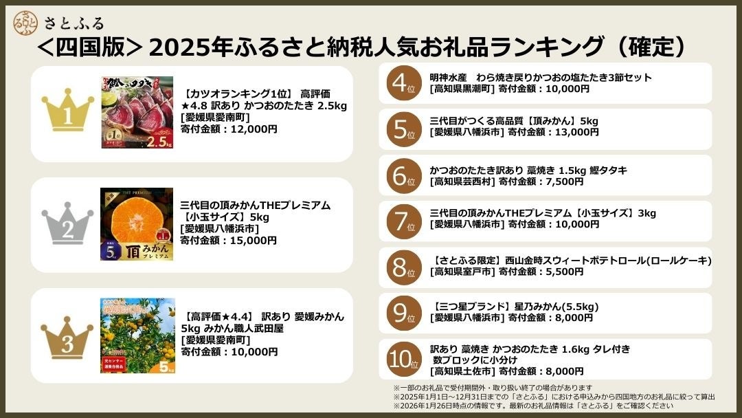 ふるさと納税ポータルサイト「さとふる」を運営する株式会社さとふる(本社:東京都中央区、代表取締役社長 兼 CEO:藤井 宏明)は、「さとふる」における<四国版>2025年ふるさと納税人気お礼品ランキング(確定)(※1)を発表します。