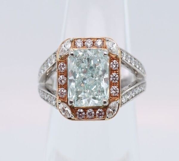 ファンシー・グリーン・ブルー・ダイヤモンド・リング。この希少な宝石の周囲には、ピンクと