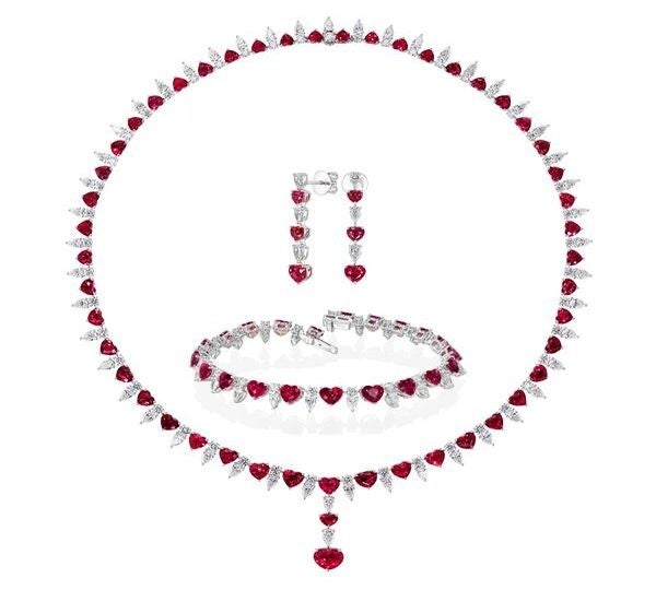 ジュエリー。ネックレスはルビー26.70ct,ダイヤ4.53ct。イヤリングルビー2.20/2.70ct,