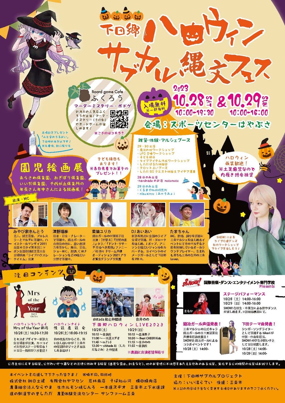 今回「下田郷ハロウィンサブカル縄文フェス」に初めて参加させていただき、大きな企画として三条マルシェ【公式】キャラクターの声優と、下田テーマソングを歌唱するアーティストのお披露目の場を任せていただきました。その他に、イベントテーマにあったSHOW !ならではの企画を考え、学生アーティストのライブステージとライブ応援グッズのワークショップも企画をしました。