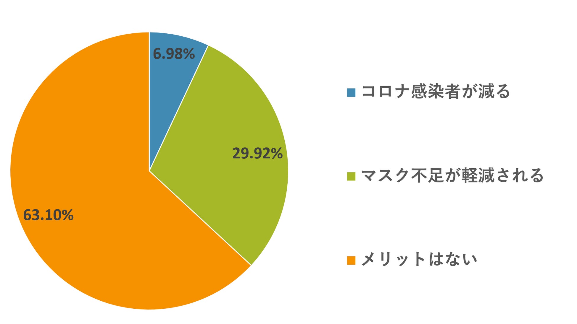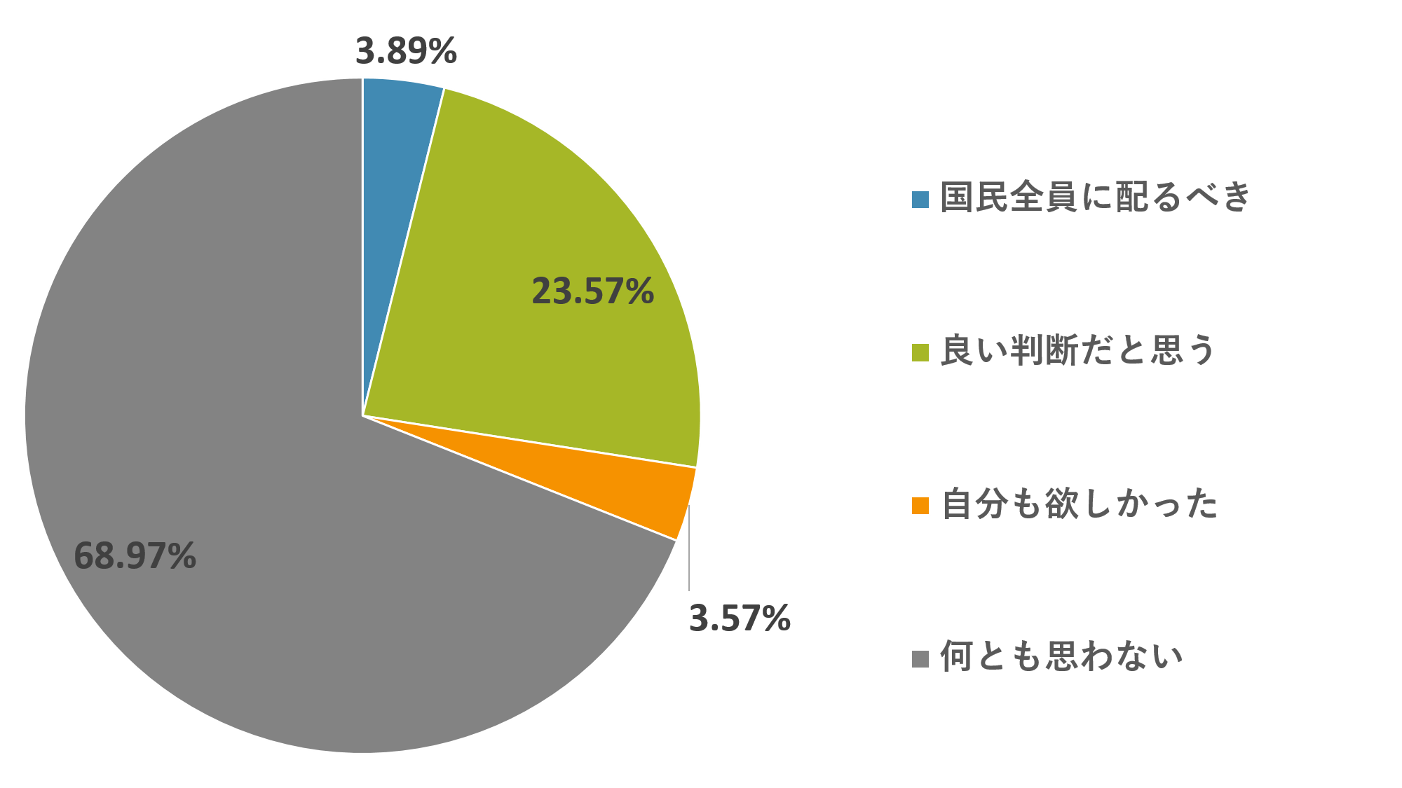 「今回の希望者のみアベノマスクが配布される事についてどう思いましたか。」に対し、「国民全員に配るべき 3.89%」「良い判断だと思う 23.57%」「自分も欲しかった 3.57%」「何とも思わない 68.97%」と回答。
