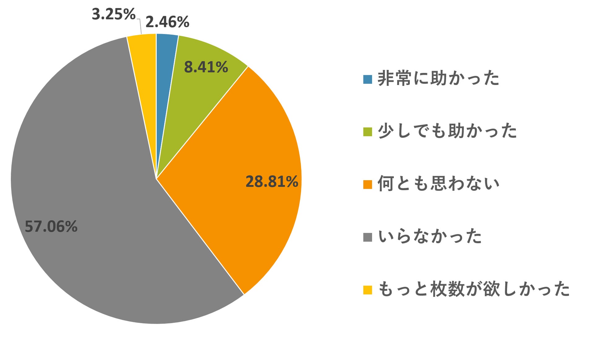「前回アベノマスクが配布された時どう思いましたか。」に対し、「非常に助かった 2.46%」「少しでも助かった 8.41%」「何とも思わない 28.81%」「いらなかった 57.06%」「もっと枚数が欲しかった 3.25%」と回答。