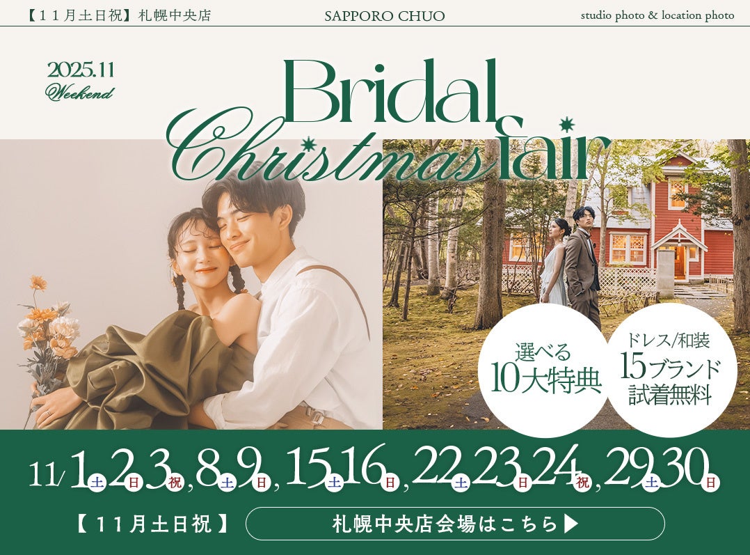 この度、2025年11月土日祝限定で、お得で楽しいブライダルフェアを札幌エリアの店舗で開催します。運命の一着を探している方、憧れのドレスを試着したい方は、この機会にぜひご来店ください。